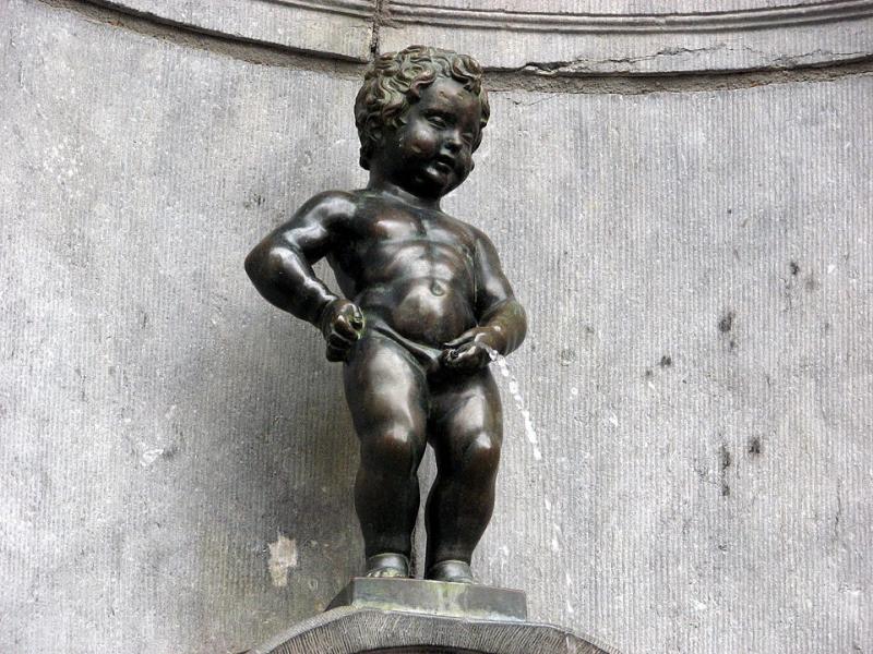 Manneken Pis (Dutch for 'Little Pissing Man') is a landmark in the centre of Brussels, depicting a naked little boy urinating into a fountain's basin